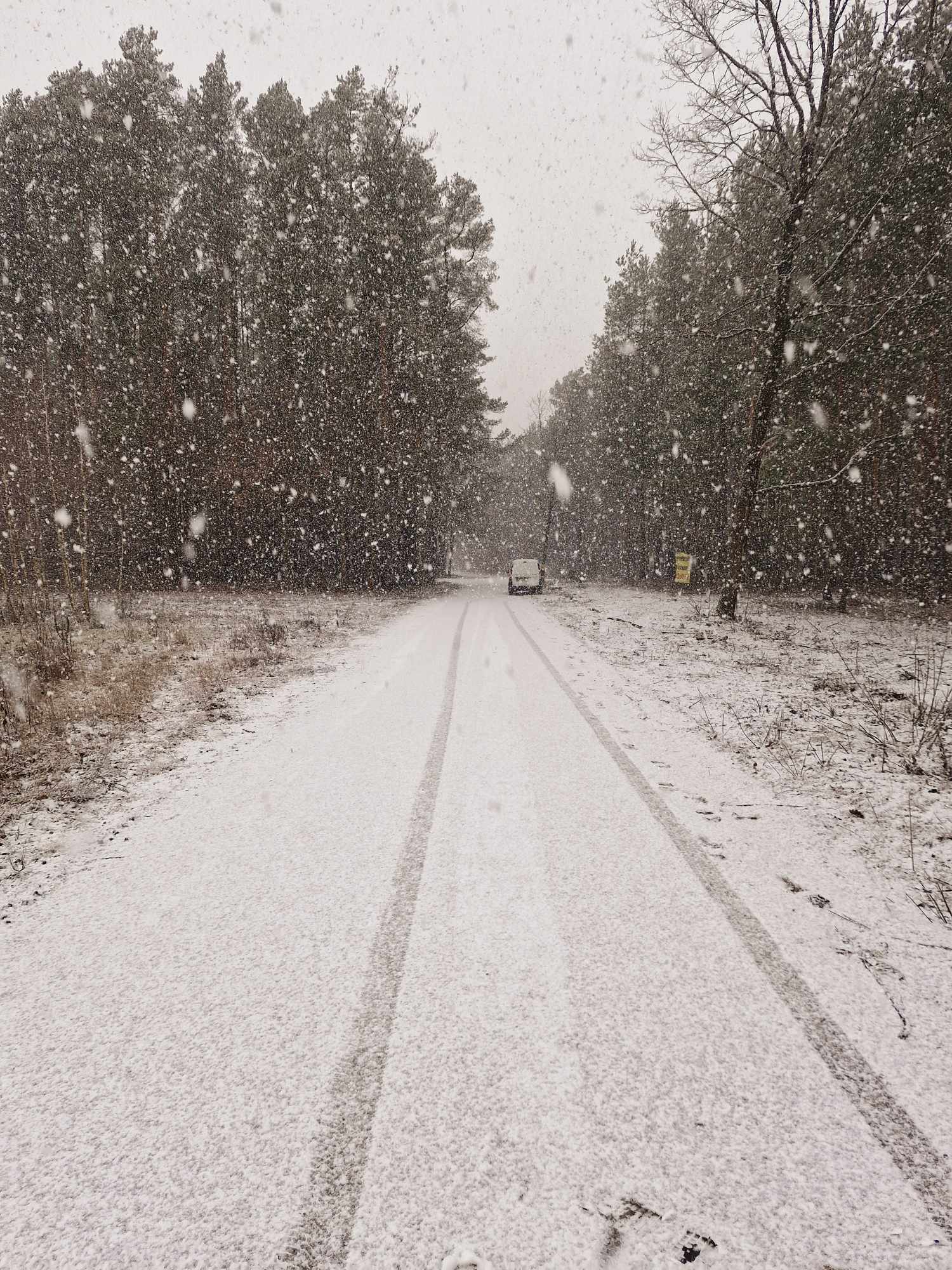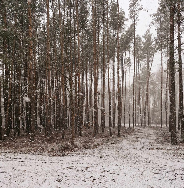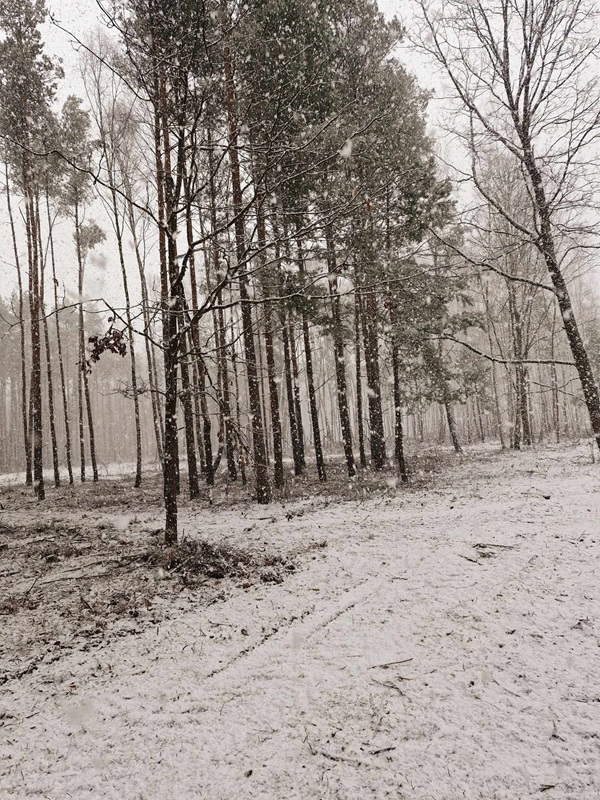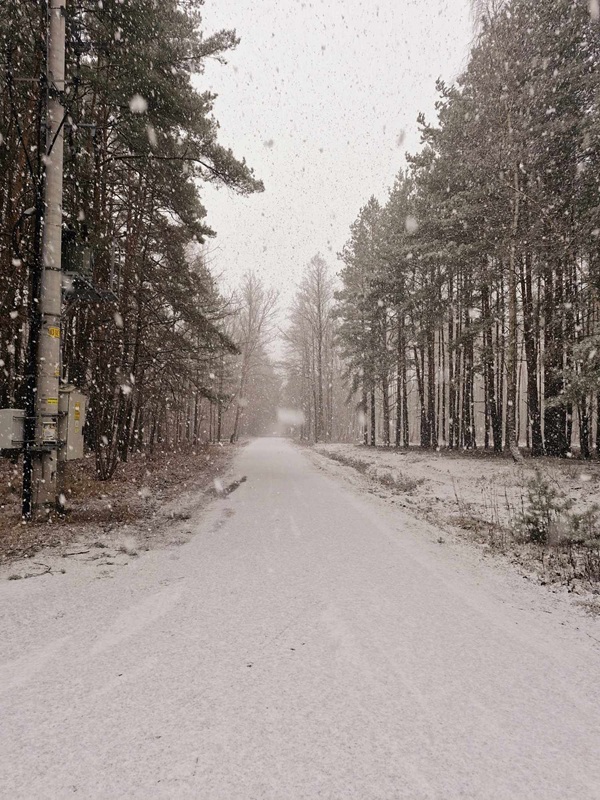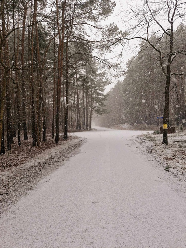 |Drga wysypana szutrem. PO lewej stronie lasek liściasty. Po prawej pole.
