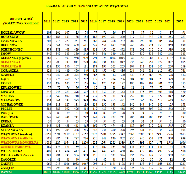 Aktualna liczba osób zameldowanych w naszej gminie na pobyt stały wynosi 14 485 (stan na dzień 31.12.2025 r.). W ciągu roku liczba mieszkańców wzrosła o 370. Ta liczba uwzględnia: 623 osoby, które przybyły do naszej gminy i zameldowały się na stałe, 121 nowo narodzonych dzieci oraz 85 osób, które wymeldowały się z naszej gminy i 96 osób, które zmarły. Przyrost naturalny, czyli liczba stanowiąca różnicę między urodzeniami a zgonami, wyniósł 25.
